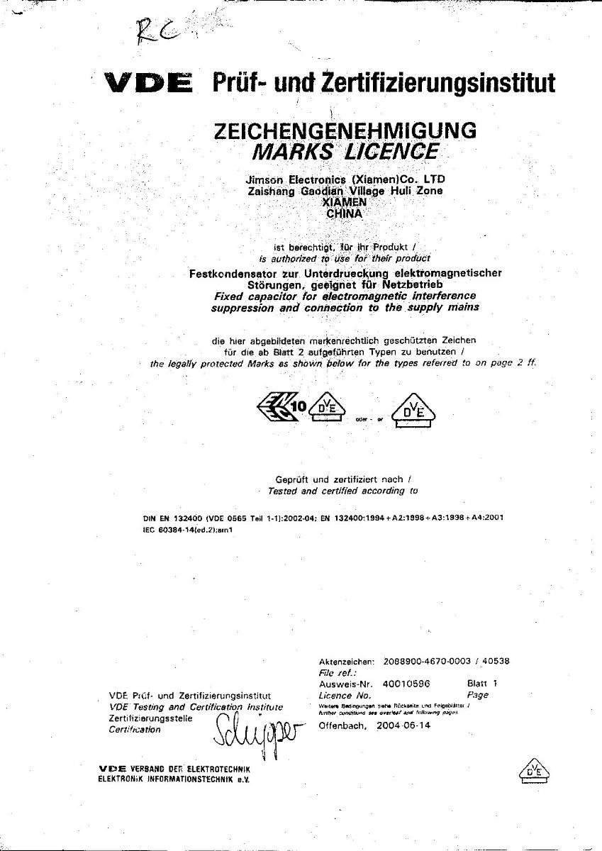 IEC 384-14 (2nd Edition,1993) UL1414,UL1283,GB/T 14472-1998,EN132400